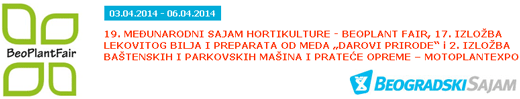 01.01.1970.U Beogradu će se na Beogradskom sajmu od 03. do 06.04.2014 godine održati 19. međunarodni sajam hortikulture - BEOPLANT FAIR. U isto vreme održaće se 17. izložba lekovitog bilja i preparat od meda - DAROVI PRIRODE i 2. izložba baštenskih i parkovskih mašina i prateće opreme - MOTOPLANTEXPO.
