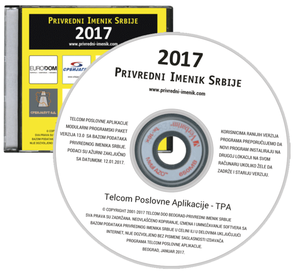 27.01.2017.Novi Program/CD Privrednog Imenika Srbije za 2017. godinu je upravo izašao. U toku je distribucija pretplatnicima preko Pošte Srbije, a Program se može beplatno preuzeti i testirati sa sajta Privrednog Imenika Srbije. Program Privrednog Imenika Srbije je od ove godine dostupan i u verziji na Engleskom jeziku, a softver se distribuira pod naslovom B2B Serbia – Telcom Business Application.