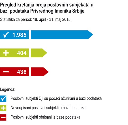 08.06.2015.U periodu od 18.04. do 31.05.2015. ažurirane su informacije za 1.985 poslovnih subjekata u bazi podataka Privrednog Imenika Srbije, obrisano je 436 i uneseno novih 404, tako da baza podataka Privrednog Imenika Srbije sada sadrži 44.414 poslovnih subjekata iz Republike Srbije.