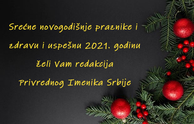 29.12.2020.Redakcija Privrednog Imenika Srbije želi svima srećne novogodišnje praznike i zdravu i uspešnu novu 2021. godinu! Svim saradnicima, partnerima, oglašivačima, pretplatnicima i korisnicima Privredni Imenik Srbije želi puno uspeha u poslovnoj 2021. godini!